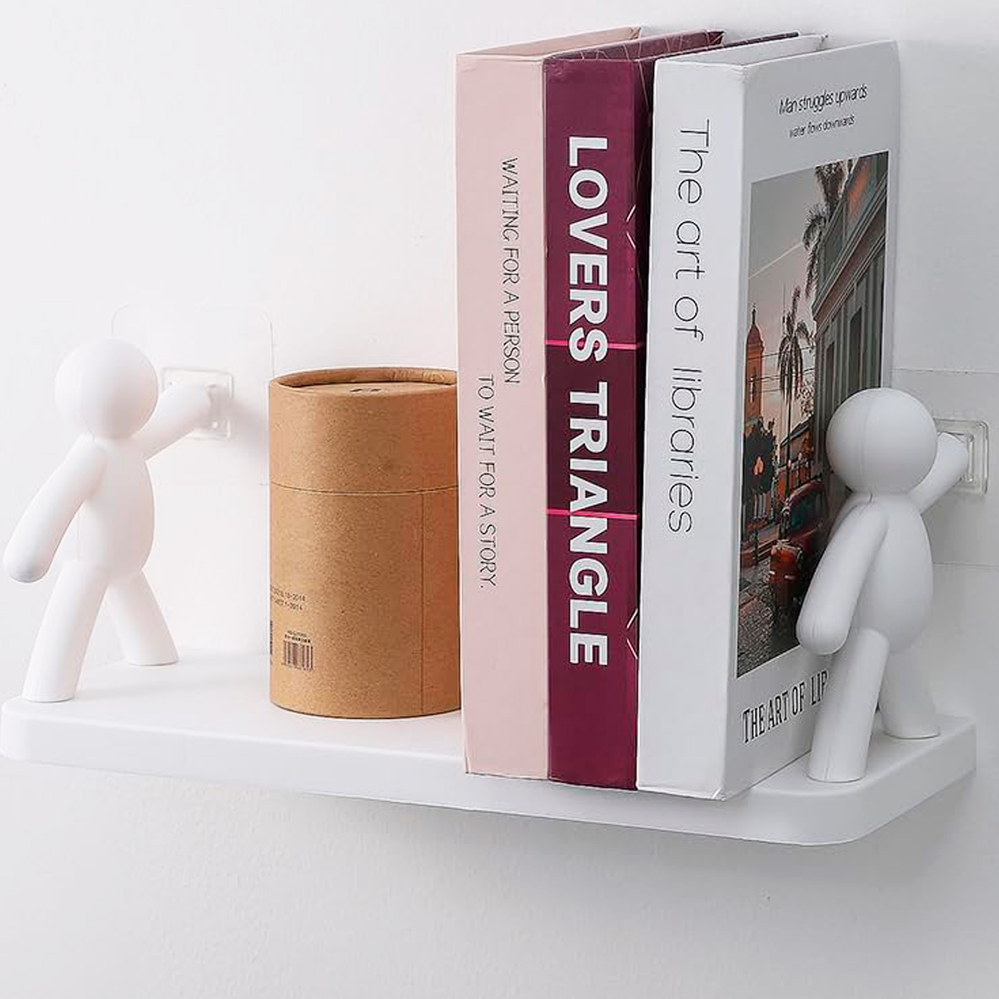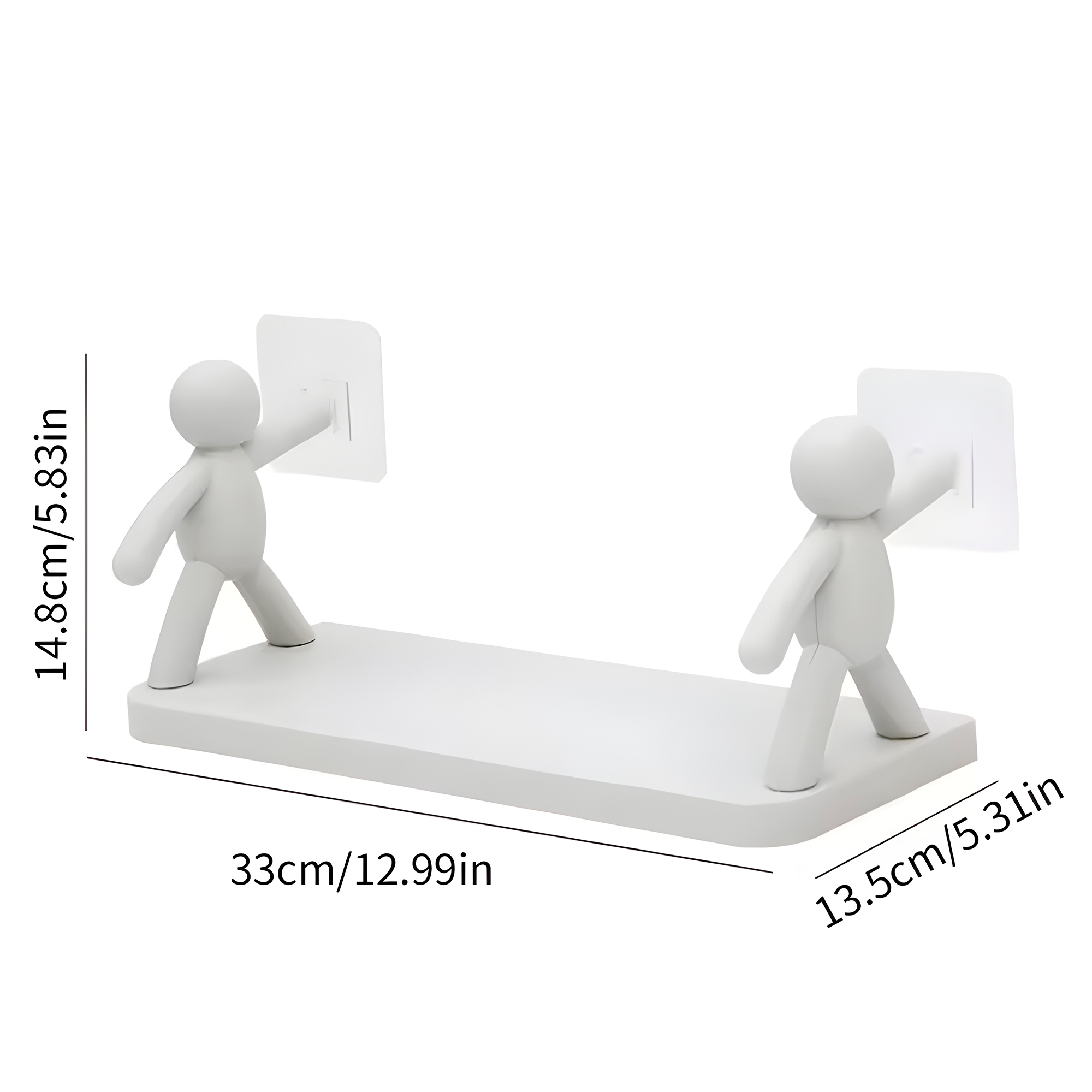 Los estantes de pared en color blanco cuentan con dos pequeñas figuras de pie a cada lado, lo que les da un toque encantador y llamativo. Su diseño y acabado hacen que estos estantes flotantes sean perfectos para complementar casi cualquier estilo decorativo en tu hogar.