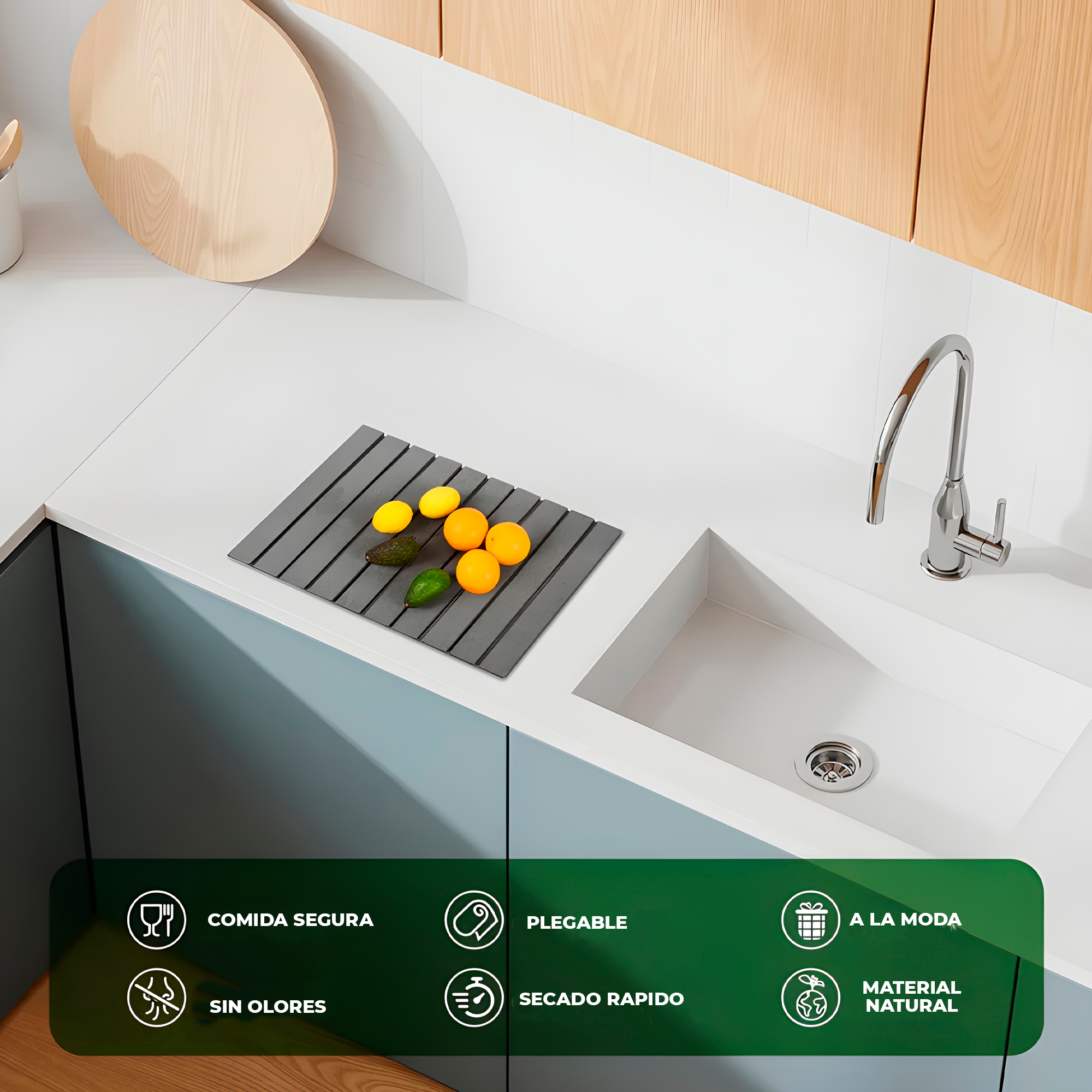 Eco‑friendly y elegante: producto sostenible y biodegradable; su acabado tipo piedra pulida aporta un toque sobrio y moderno a cualquier cocina.